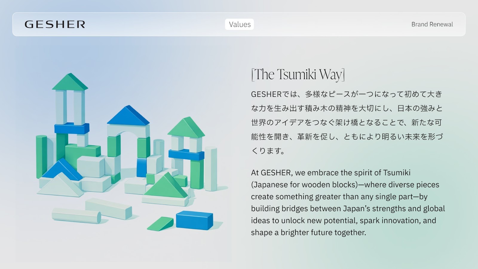 GESHER Inc. (Headquarters: Minato-ku, Tokyo; CEO: Yohei Harada; hereinafter "Gesher") is pleased to announce that it has refreshed its Mission, Vision, and Values (MVV) and Corporate Identity (CI), and completely renewed its corporate website. Since its founding in 2020, our company has consistently leveraged "building an organization with multinational members" as its core strength. After several months of discussion, we have redefined "cross-border" for the coming era.
